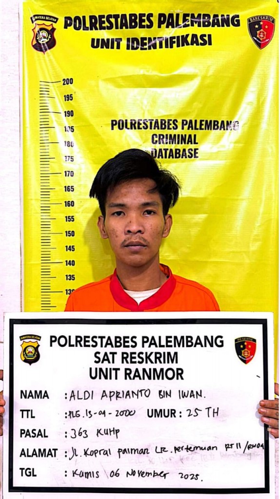 Kaganga.com Palembang - Upaya pelarian Aldi Apriyanto (25) akhirnya kandas. Pria asal Lorong Pertemuan, Kelurahan Bagus Kuning, Plaju, Palembang itu ditangkap setelah lama diburu polisi karena terlibat kasus pencurian sepeda motor. Ia diringkus Unit Ranmor Polrestabes Palembang pada Sabtu (15/11/2025) malam dalam sebuah penyergapan di kediamannya.