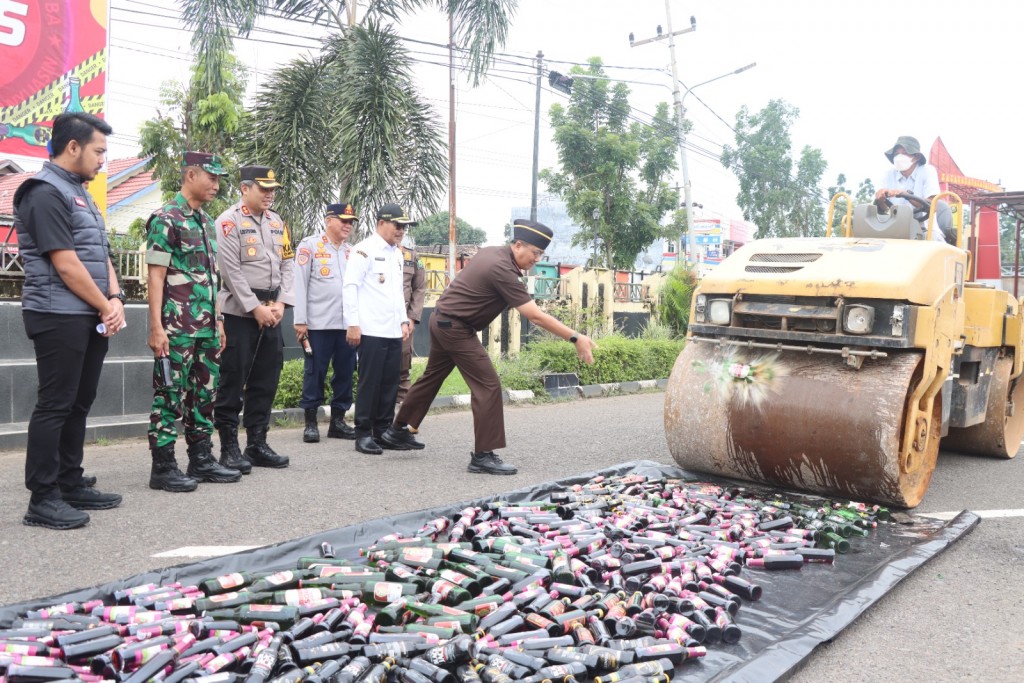 Kaganga.com,Palembang - Bertempat di halaman apel Mapolres Musi Banyuasin (Muba), Kamis (20/3) pagi. Sebanyak 1.149 botol minuman keras (miras) dari berbagai merek yang merupakan barang bukti hasil Operasi Pekat Musi Tahun 2025 dimusnahkan. Pemusnahan barang bukti itu, dilakukan dengan cara dilindas menggunakan alat berat.