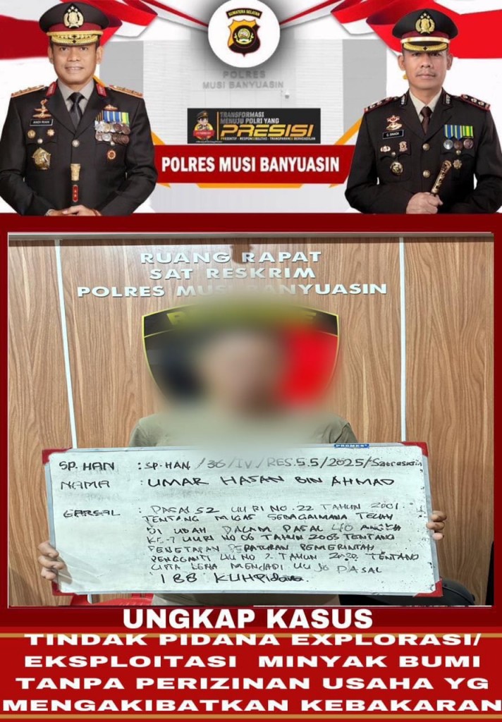 Kaganga.com Muba -Kepolisian polsek keluang Resor Musi Banyuasin, berhasil mengamankan Umar Hasan (51) warga Kelurahan Gasing Kecamatan Talang Kelapa Kabupaten. Banyuasin, dalam perkaran dugaaan kepemilikan sumur minyak illegal yang terbakar beberapa waktu lalu sekira pukul 14.00 wib di Lahan Kebun Kelapa Sawit (HGU) milik Pt. Hindoli yang terletak di Desa Tanjung Dalam Kecamatan Keluang Kabuapaten Musi Banyuasin.