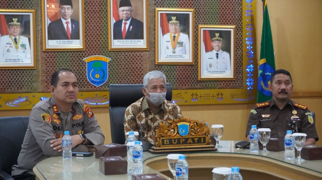 Kaganga.com OKI -- Bupati Ogan Komering Ilir (OKI), H. Iskadar, SE bersama Kapolres OKI, AKBP. Dili Yanto, S. IK, SH, MH dan Kepala Kejaksaan Negeri (Kajari) OKI, Dicky Darmawan, SH mengikuti penandatanganan kerjasama antara Kementerian Dalam Negeri, Kejaksaan Republik Indonesia, dan Kepolisian Negeri Republik Indonesia tentang Koordinasi Aparat Pengawasan Internal Pemerintah (APIP) dengan Aparat Penegak Hukum (APH) terkait penanganan laporan atau pengaduan dalam penyelenggaraan Pemerintah Daerah secara virtual, Rabu, (25/01).