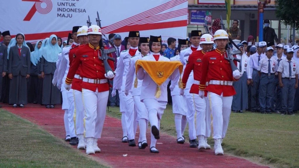 Kaganga.com OKI -- Pelaksanaan upacara peringatan HUT RI ke-78 di Kabupaten Ogan Komering Ilir (OKI) berlangsung khidmat. Wakil Bupati OKI, Dja'far Shodiq menyampaikan apresiasi dan terimakasih kepada petugas dan peserta upacara penaikan maupun penurunan bendera dalam rangka HUT RI ke-78.