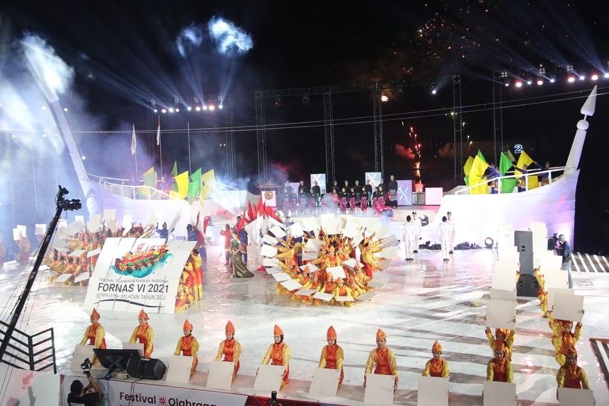 Adapun opening ceremony FORNAS VI 2021 Sumsel Tahun 2022 dibuka dengan begitu spektakuler dengan sajian penampilan tarian, drama teaterikal dan musik yang begitu menarik perhatian masyarakat dan pegiat olahraga.