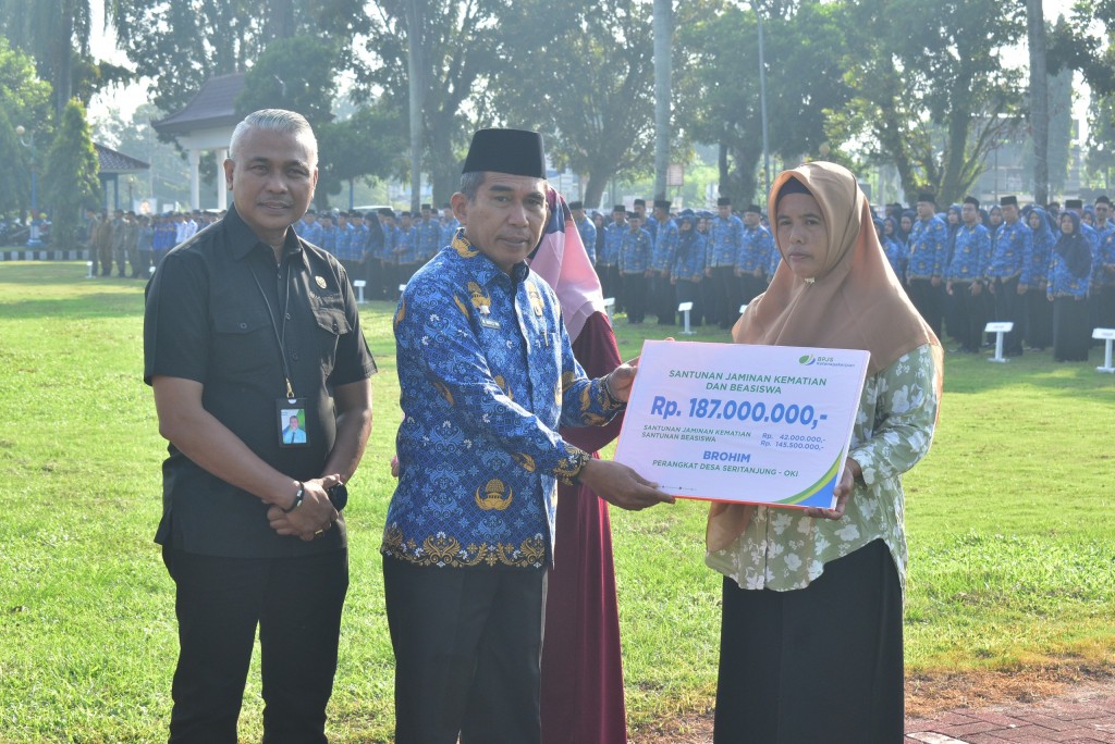 Di sela-sela Apel, Pj Sekda OKI didampingi kepala BPJS Ketenagakerjaan Palembang, menyerahkan santunan Jaminan Kematian kepada Peserta BPJS Ketenagakerjaan yang telah dianggarkan oleh Pemda OKI.