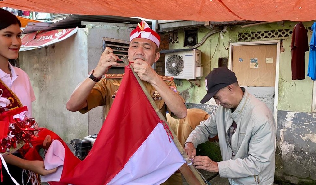 Kaganga.com,Palembang - Sekretaris Daerah Kota Palembang Ratu Dewa membagikan bendera murah putih di kawasan rumah susun, Kelurahan 24 Ilir, Kecamatan Bukit Kecil, Senin (15/8/2022).