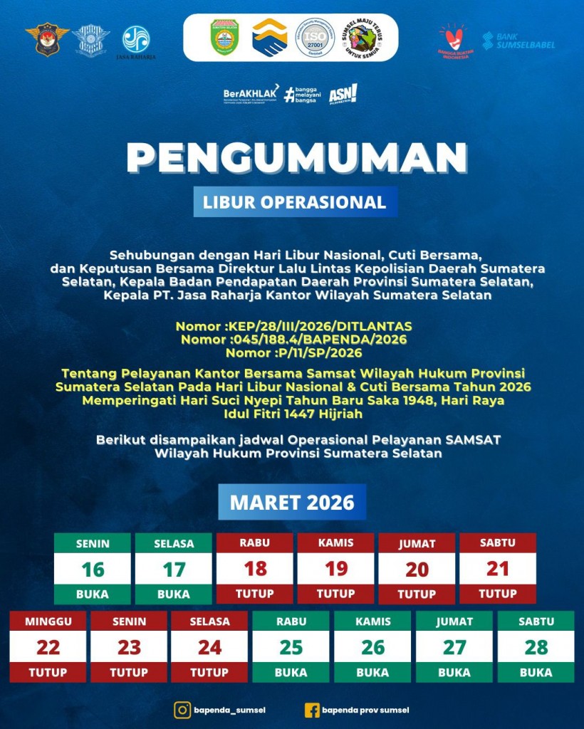 Selain jadwal libur pada Maret, SAMSAT Sumsel juga mengumumkan jadwal penyesuaian layanan pada awal April 2026. Pelayanan akan tutup pada Jumat, 3 April 2026 dan Minggu, 5 April 2026 dalam rangka hari libur keagamaan.