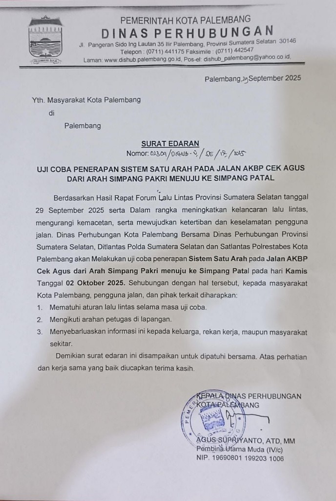 Kaganga.com Palembang – Rekayasa lalu lintas kembali dilakukan di Kota Palembang. Kali ini, Dinas Perhubungan (Dishub) Kota Palembang bersama instansi terkait akan memberlakukan uji coba sistem satu arah di Jalan AKBP Cek Agus mulai Kamis, 2 Oktober 2025.