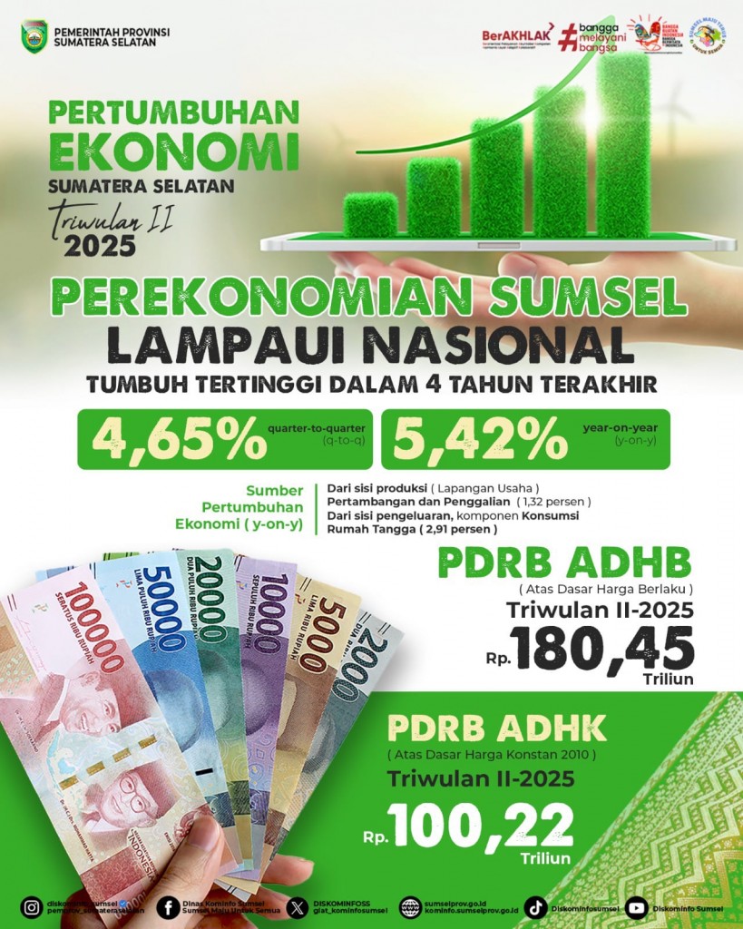 Kepala BPS Sumsel, Moh Wahyu Yulianto, menyampaikan bahwa pertumbuhan ekonomi Sumsel mencapai 5,42 persen secara tahunan (year-on-year) dan 4,65 persen secara kuartalan (quarter-to-quarter). Capaian ini tidak hanya melampaui pertumbuhan ekonomi nasional yang berada di angka 5,12 persen (y-on-y) dan 4,04 persen (q-to-q), tetapi juga menunjukkan daya saing ekonomi daerah yang semakin solid.