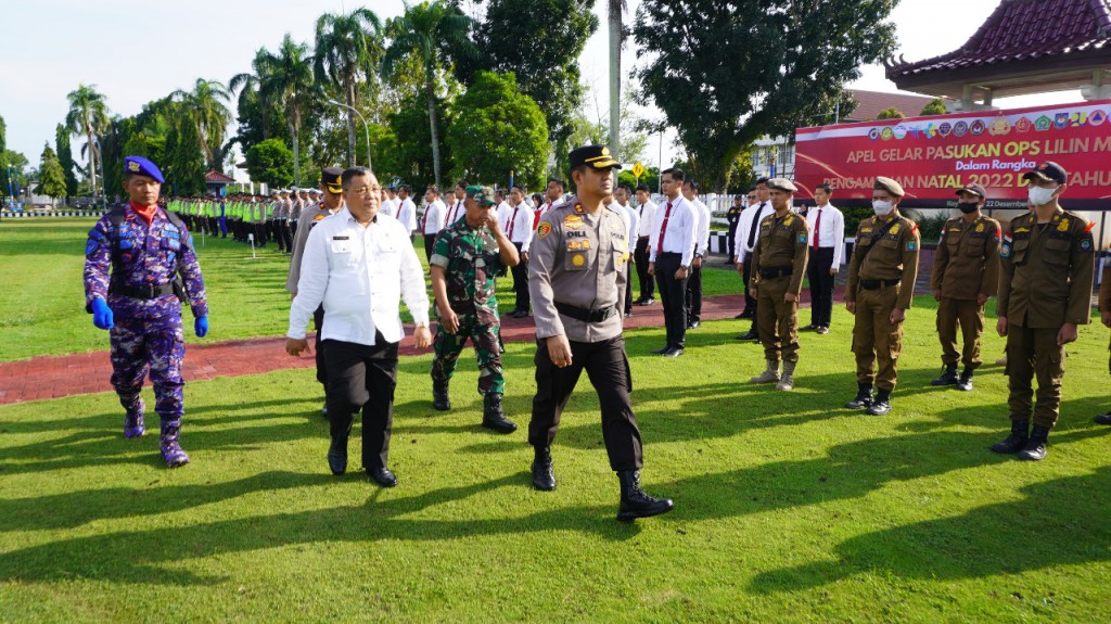 Kaganga.com OKI -- Ratusan personel gabungan dari unsur TNI, Polri, Satpol PP, Damkar, Dishub, Dinkes, dan BPBD Kabupaten Ogan Komering Ilir (OKI) siap mengamankan perayaan natal tahun 2022 dan perayaan tahun baru 2023. Sebagai bentuk kesiapan awal, digelar apel pasukan dalam rangka Operasi Lilin Musi tahun 2022 di Halaman Kantor Bupati OKI, Kamis (22/12). Bertindak selaku Inspektur Upacara Kapolres OKI, AKBP. Dili Yanto, SH, S.IK, M.Si
