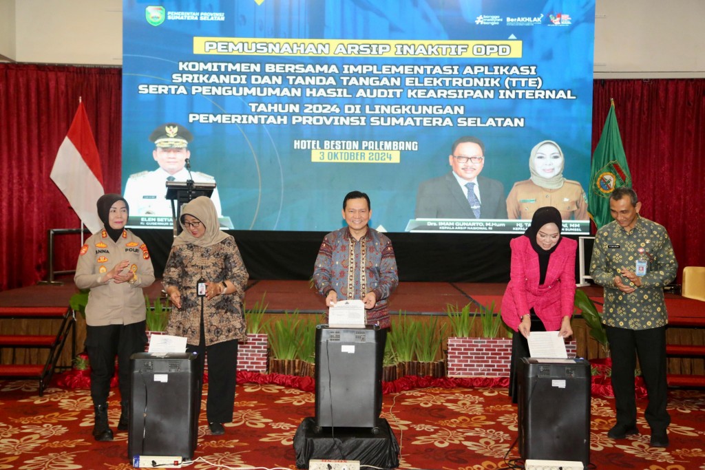 Apresiasi tersebut ditandai dengan penandatangan Komitmen Bersama Implementasi Aplikasi Sistem Informasi Kearsipan Dinamis Terintegrasi (SRIKANDI) dan Tanda Tangan Elektronik (TTE) serta Pengumuman Hasil Audit Kearsipan Internal tahun 2024 yang dipusatkan di Ballroom Hotel Beston Palembang, Kamis (3/10/2024).