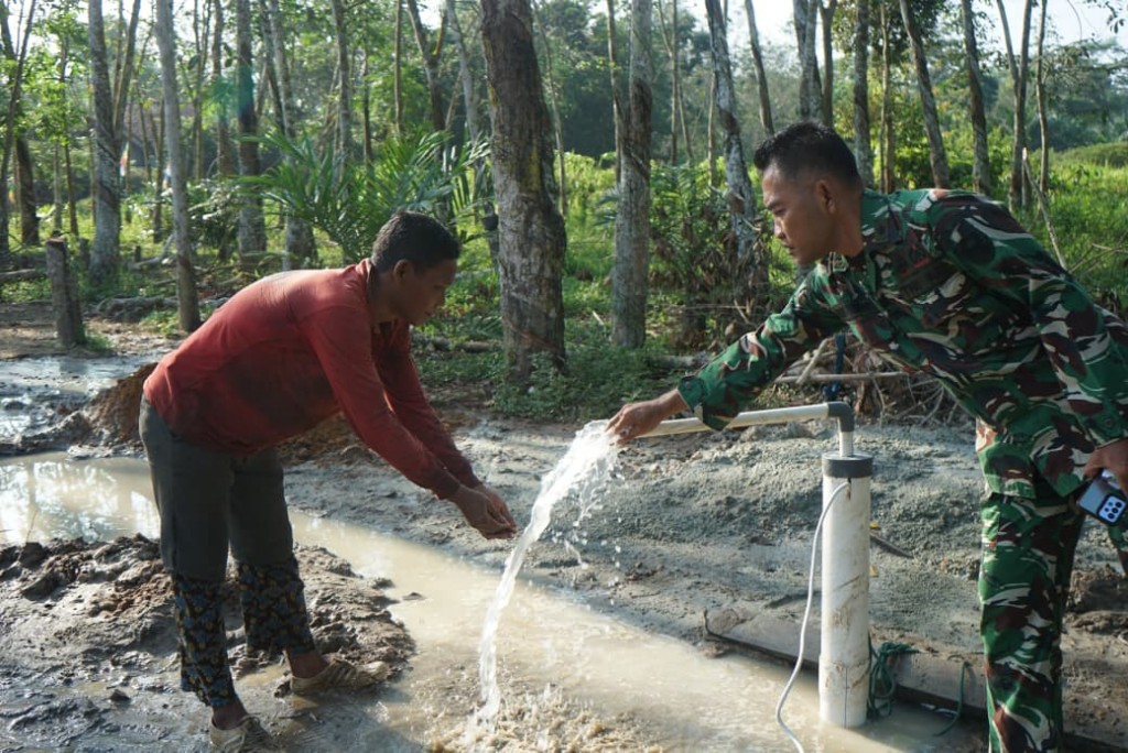Anggota Satgas TMMD bersama masyarakat setempat terlihat bahu-membahu dalam proses pengerjaan, mulai dari persiapan alat hingga pelaksanaan pengeboran. Kebersamaan ini menjadi wujud nyata kemanunggalan TNI dengan rakyat.