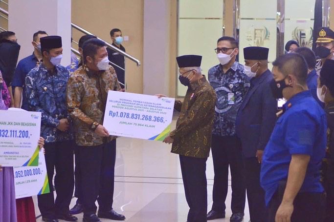 Dimana bantuan berupa Sembako dan BLT BBM dengan total bantuan yang diserahkan Rp. 448,748,111,000,-. Selain itu juga Wapres juga menyerahkan nominal pembayaran klaim seluruh program BPJS Ketenagakerjaan di Sumsel periode Agustus 2021 - Agustus 2022 sebesar Rp. 1.078.831.268.366,-.